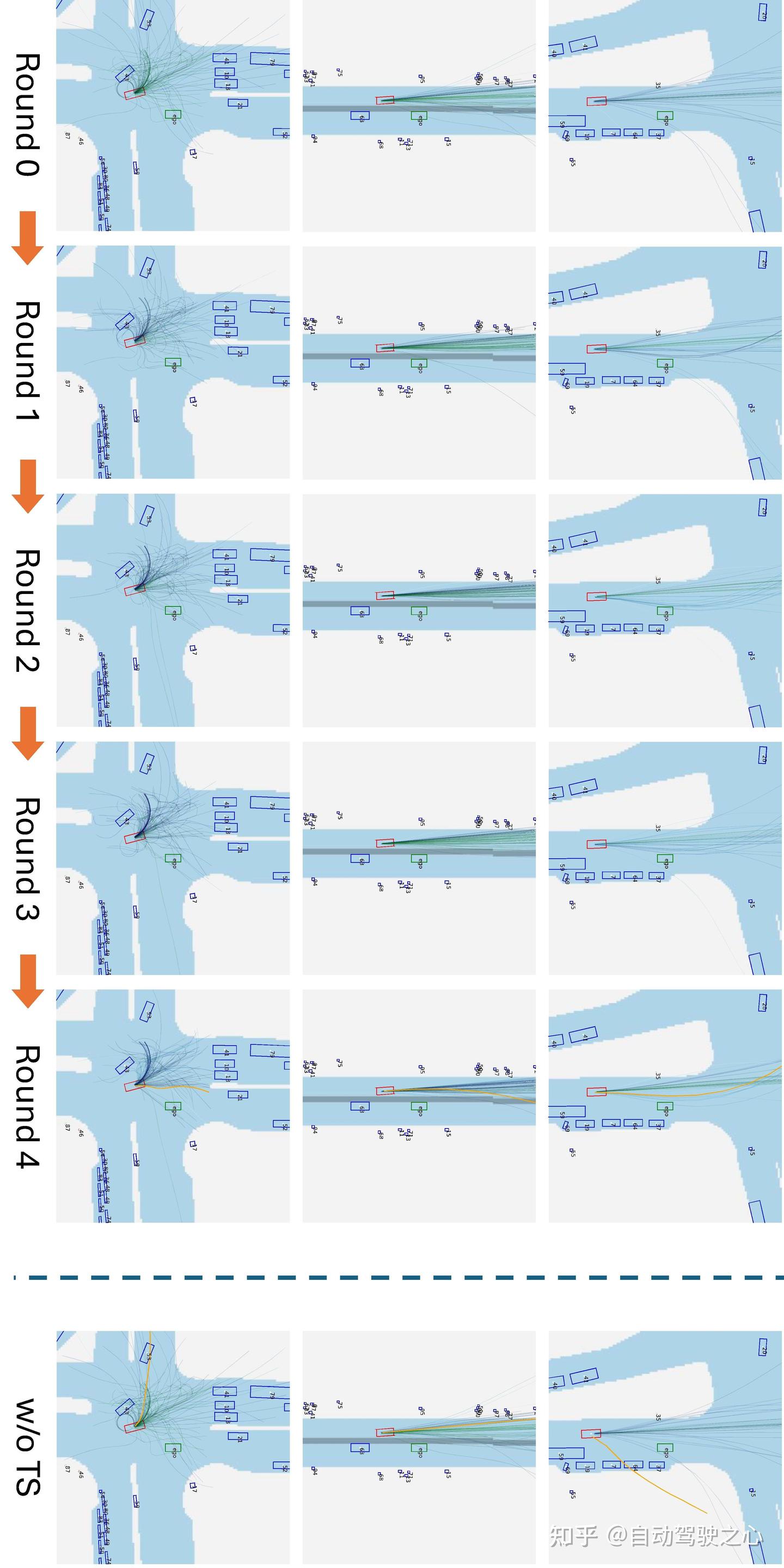 - 第一轮,从一个基于扩散模型的轨迹生成器(diffusion-based trajectory generator)中采样一批轨迹候选;