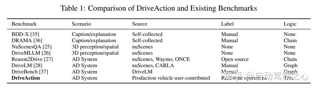 • 动作标注不真实:部分基准数据集缺乏动作级标注,仅关注感知或理解任务;而采用手动标注动作标签的方法,由于是在驾驶行为发生后生成的,无法真实反映实时驾驶意图和决策,影响了评估的可靠性和真实性。