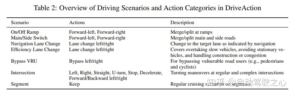 DriveAction的动作标签直接来源于用户的实时驾驶操作,能够准确捕捉驾驶员决策时的真实意图。为了与端到端大型模型的输出粒度匹配,这些标签被离散化为高级动作,更好地反映了人类驾驶决策的分类性质。