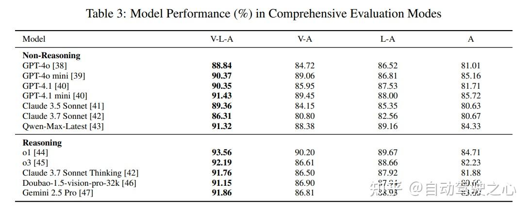 推理模型在复杂场景下通常优于非推理模型,例如o1和o3在V-L-A模式下的准确率超过92%。但在无信息模式下,一些非推理模型的表现与推理模型相当甚至更好。