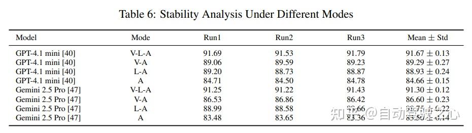 通过对GPT-4.1 mini和Gemini 2.5 Pro在不同信息输入模式下的性能进行三次重复实验,结果显示它们的标准偏差通常低于0.3,表明DriveAction基准能够对自动驾驶模型进行稳定、客观的评估,确保性能测量在重复试验中具有可靠性和可重复性。