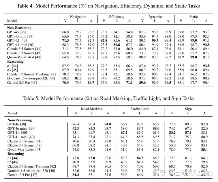 • 导航任务:导航仍然是一个持续的挑战,尽管大多数模型可以对明确的导航指令做出响应,但它们的得分明显较低,表明在准确的车道定位和全面的导航理解方面能力有限。