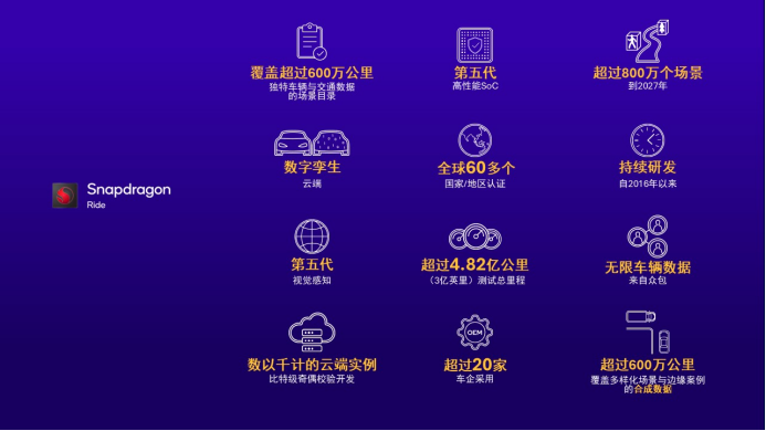 随着汽车行业持续演进,Snapdragon Ride平台在塑造未来交通方面发挥了关键作用,为汽车创新树立全新标杆。白皮书显示,Snapdragon Ride平台已在60多个国家和地区落地,平台已构建起一个覆盖超过600万公里独特车辆与交通数据的场景目录,驾驶辅助测试总里程数超过4.82亿公里。