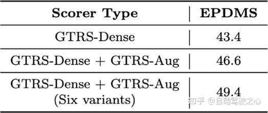 为了最大化整体性能,我们对轨迹生成器与轨迹评分器进行了集成。在生成阶段,我们融合了由扩散策略生成的动态轨迹与静态词表轨迹;在评分阶段,我们使用多个互补的评分器(如 GTRS-Dense、GTRS-Aug 等)进行联合评估,从不同维度全面衡量轨迹质量。每个评分器都有其独特优势——前者擅长泛化,后者对于感知变化和轨迹的精细差异更鲁棒。模型集成提升了整体决策的可靠性与鲁棒性。最终,这一策略将 EPDMS 提升至 49.4,也是本次 NAVSIM v2 挑战赛的冠军方案。