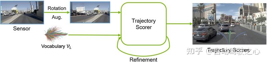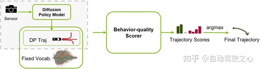 (1)基于扩散模型的轨迹生成器,提供丰富细致的动态轨迹候选;(2)超密集轨迹词表结合 Dropout 泛化策略,强化评分器对多样轨迹分布的 适应性;(3)传感器视角扰动与精细化评分模块,增强对长尾场景与微小行为差异的辨识能力。