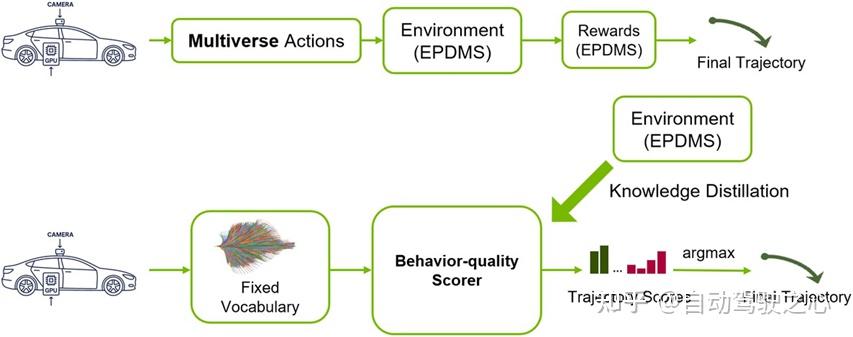 在去年的比赛中,我们提出了 Hydra-MDP 端到端自动驾驶框架。该框架不再依赖单一 路径的模仿,而是使用大量多模式的轨迹候选,并通过与环境的交互获得基于规则的奖励信号。我们使用这些奖励来训练出一个能够对不同规则维度进行打分的轨迹评分模型。相比于仅依赖人类演示的模仿学习方法,该框架更强调轨迹与环境之间的反馈关系,能够在复杂场景中更好评估和选择安全的驾驶行为,从而实现更高的鲁棒性和安全性。