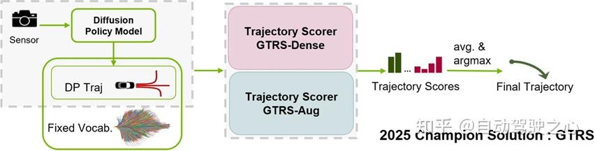 在这次的 NAVSIM 挑战赛中,我们提出了 GTRS(Generalized Trajectory Scoring)框架。这个框架是一种通用的端到端多模态规划方法,能够统一处理静态词表轨迹与动态生成轨迹的评分任务,显著提升模型的泛化能力与轨迹辨别能力。最终,GTRS在 NAVSIM v2 数据集上取得了当前最先进的规划表现,荣获本次挑战赛冠军。
