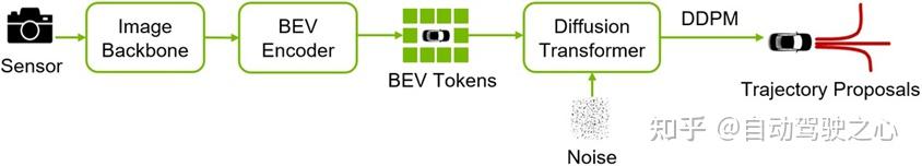 在介绍我们的方案之前,我们先以扩散模型为例,简要回顾端到端自动驾驶学习中的模仿学习范式。扩散模型近年来在端到端自动驾驶中获得广泛应用,其核心思想是从以环境特征为条件,通过加入噪声与逐步去噪的过程生成多模态的未来轨迹候选,具备较强的轨迹多样性与拟合能力。但这类基于模仿学习范式的核心问题在于其过度依赖人类演示数据。虽然它可以通过模仿人类行为达到较低的误差(如 L2 距离),但由于只能学习人类展示过的行为轨迹,它在面对未复杂驾驶情境时,难以做出鲁棒的决策,同时在未见过的新场景下的泛化能力也存在不足。