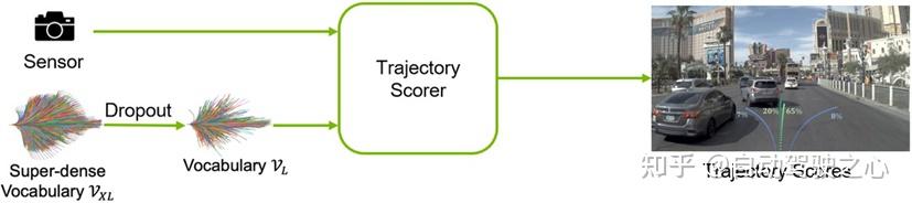 除了轨迹生成端,我们在轨迹评分端使用 GTRS-Dense 模型进行更有效的轨迹评估。该模型在训练时使用了一个超密集的轨迹集合,以提升评分器对多样轨迹分布的泛化能力,使其具备更强的轨迹评分能力。为了防止模型过拟合特定的轨迹模式,我们在训练过程中引入了随机 Dropout 策略——每次仅保留一半的轨迹进行训练,从而实现有效的正则化。实验结果表明,该 Dropout 策略带来了+1.4% EPDMS的性能提升,显著增强了模型在不同场景下的泛化表现。