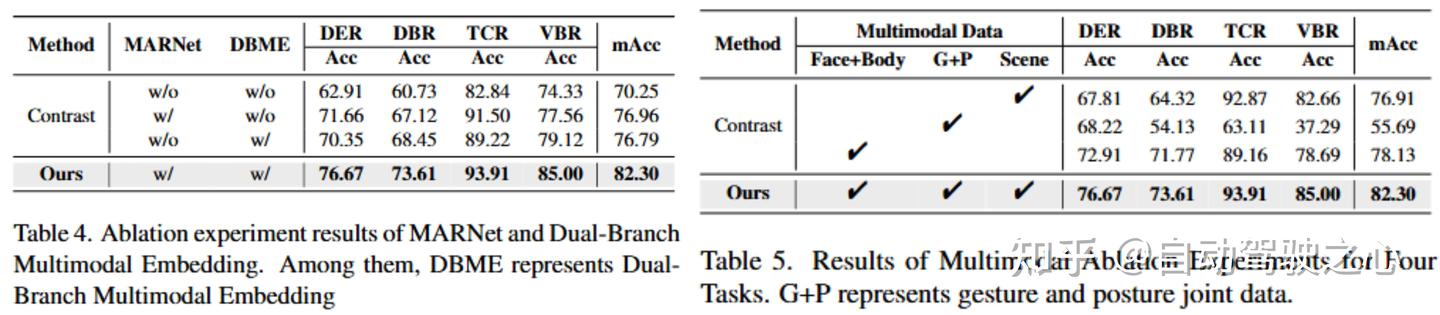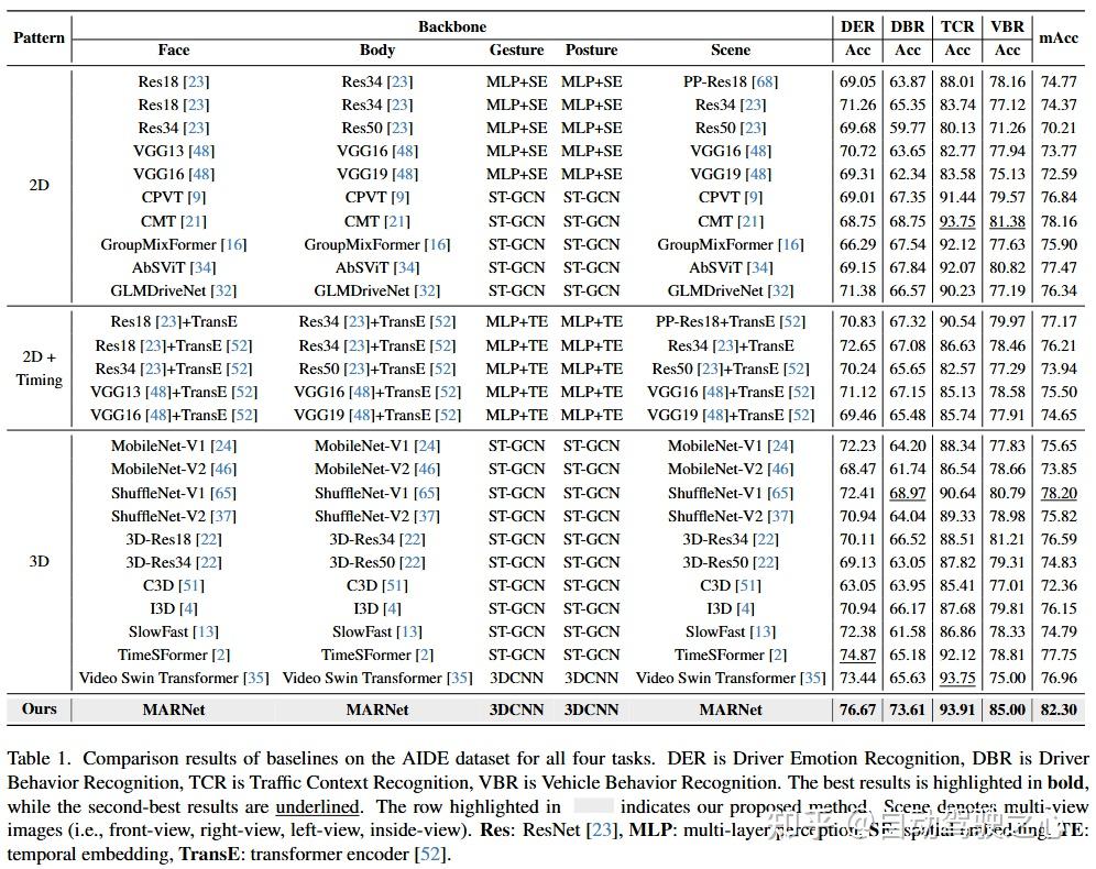 中的评估标准,根据多视角时序图像在特征提取阶段的处理方式,将对比方法划分为三类:2D 模型,2D+时序建模(将 2D 模型与序列模型结合),以及3D 模型。实验结果表明,MMTL-UniAD 在上述三种类别下均优于所有对比算法,在 mAcc 指标上实现了 4.10%–12.09% 的性能提升,并在四项任务中均取得最佳结果。特别是在驾驶员行为识别和车辆行为识别任务中,准确率分别提升了 4.64% 和 3.62%,充分验证了所提方法在多任务学习场景中的优越性与泛化能力。