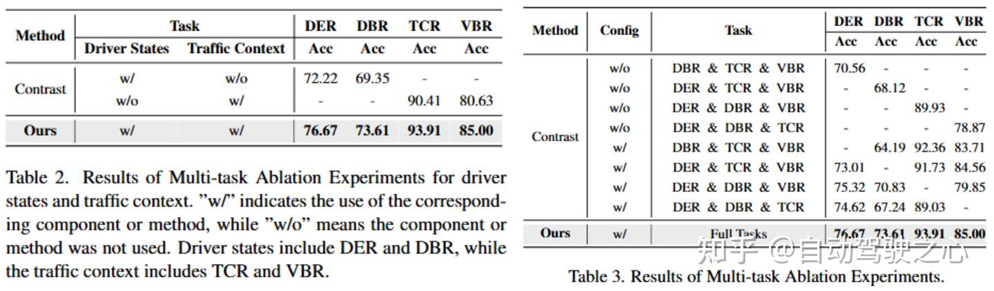 表2和表3展示了我们针对多任务学习的消融实验结果,实验共分为两组。第一组实验旨在评估驾驶员状态任务与交通环境任务之间的相互影响。如表 2 所示,当仅联合训练驾驶员状态相关任务而忽略交通环境任务时,驾驶员情绪识别和行为识别的准确率分别下降4.26%-4.45%;同理,若仅训练交通环境相关任务而排除驾驶员状态,交通情境与车辆行为识别的准确率会降低3.50%-4.37%。这些数据表明,从驾驶员状态任务中学到的特征有助于提升交通环境识别任务的性能,反之亦然,充分体现了联合学习策略在提高模型准确性与泛化能力方面的优势。