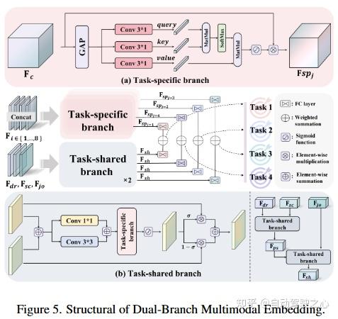 双分支多模态嵌入模块由两个主要组成部分构成:任务共享分支与任务特有分支。为缓解任务间差异所导致的负迁移问题,任务特有分支负责从多模态输入中提取任务特有特征。如图5(a) 所示,该分支通过一维卷积与多头注意力机制建模通道维度上的全局-局部交互关系,能够根据不同任务需求动态调整各模态的重要性。另一方面,为在提取任务特有特征的同时促进任务间的知识共享,我们设计了任务共享分支,如图5(b) 所示,用于整合多模态信息并学习多任务通用的共享表示。
