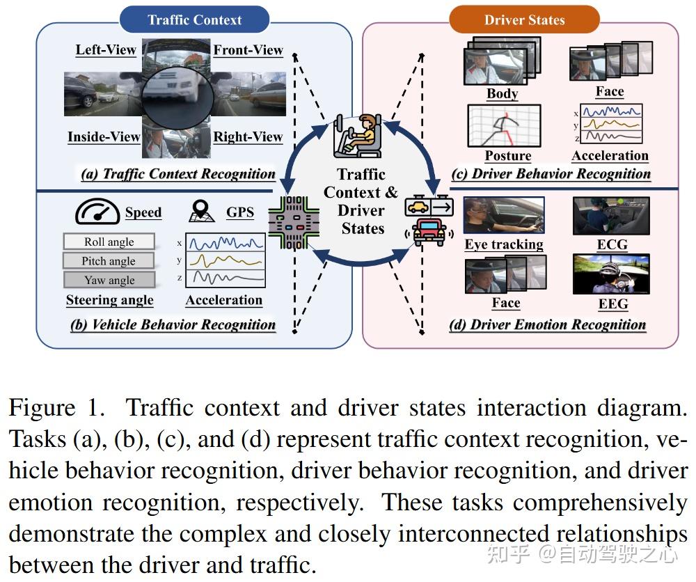在过去十年中,高级驾驶辅助系统(ADAS)通过监测驾驶员状态和周围交通环境显著提高了驾驶安全性。尽管如此,全球每年仍有约135万人死于交通事故,其中超过65%的事故与驾驶员异常的心理或生理状态有关 。因此,准确识别驾驶员状态对于ADAS至关重要,但由于驾驶员状态与交通环境之间复杂的因果关系,这一任务仍面临巨大挑战(见图1)。例如,交通拥堵可能会引发驾驶员的焦虑情绪,进而影响其驾驶行为 ;在通过交叉路口或者即将变道时,驾驶员往往会环顾四周。