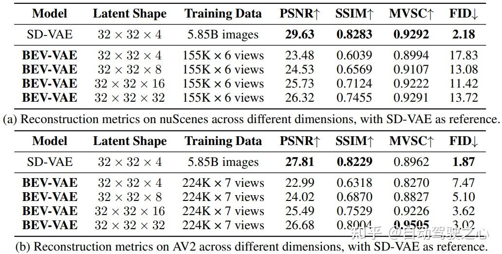 表1. 不同隐变量维度的 BEV-VAE 与 SD-VAE 在多视角图像重建中的比较:BEV-VAE 通过将多视角图像编码为统一的BEV隐变量并解码回图像来进行空间建模,而经过58.5亿张图像训练的SD-VAE仅作为图像重建的参考而不是直接基线。