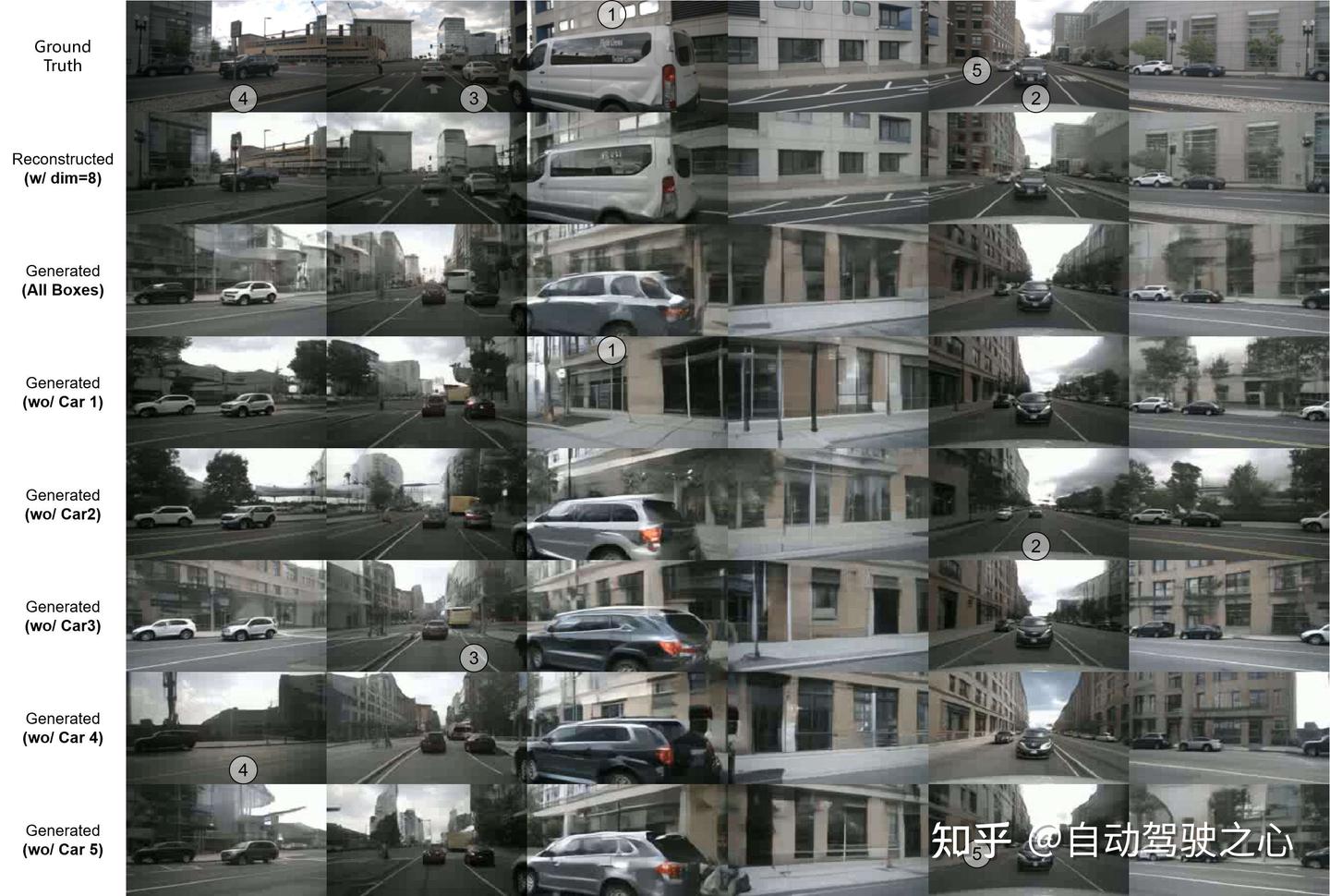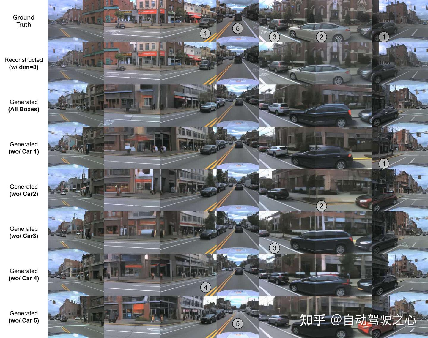 BEV-VAE支持对场景中对象的细粒度编辑,移除车辆后生成结果无明显空洞,表明模型成功学习到场景的三维结构与完整语义。 以下两张图中,第1行表示来自验证集的真实图像。第2行显示了从相应的3D边界框生成的图像。后面是移除特定车辆后生成的图像,移除的车辆用数字标签表示。注意:相同的3D标注框可能在不同的生成图像中产生外表不同的对象。