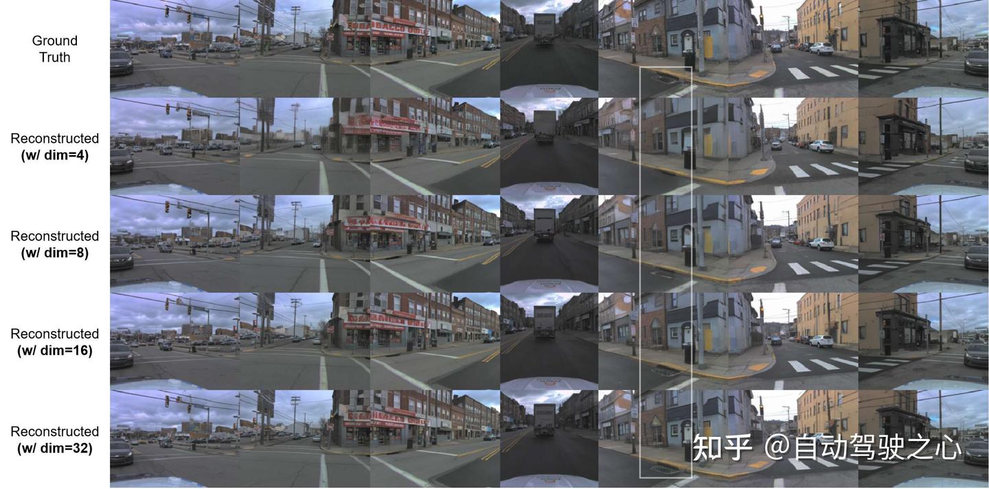 在AV2 数据集上的不同隐变量维度下的多视角图像重建的对比。第1行为验证图像,第2-5行为隐变量维数为4、8、16、32的重构图像。在更高的维度下,重建图像能更准确地还原细节,例如白色框中的井盖。