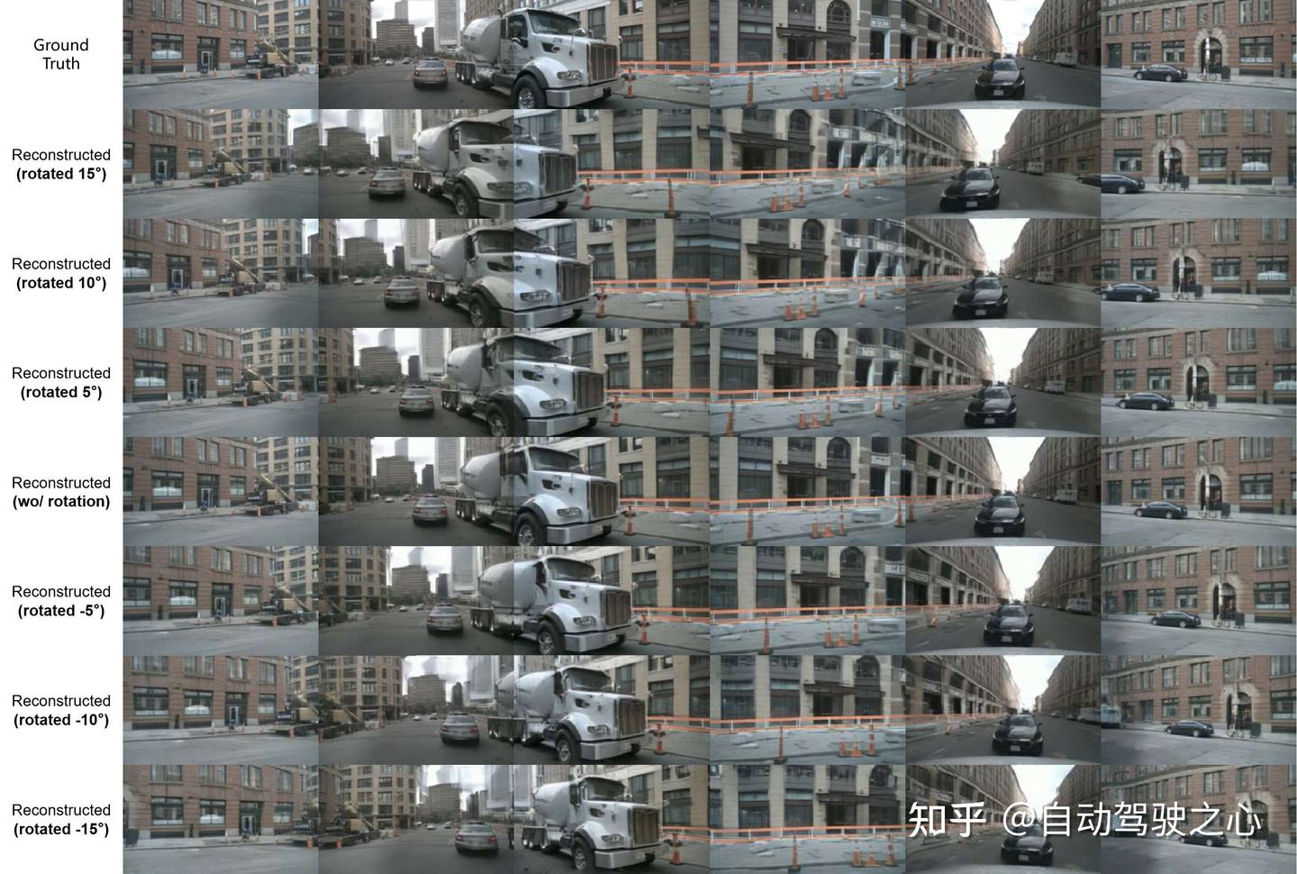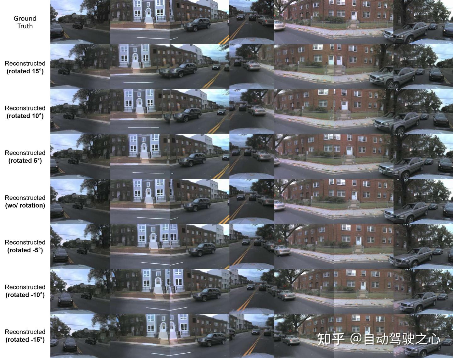 通过仅旋转相机姿态即可在BEV隐空间中实现新视角图像生成,无需重新建模或额外训练,验证了空间建模的稳定性与表达能力。第1行显示验证集的图像,后面是显示所有摄像机分别向旋转15°到-15°的重建图像。其中,隐变量维度设置为32。
