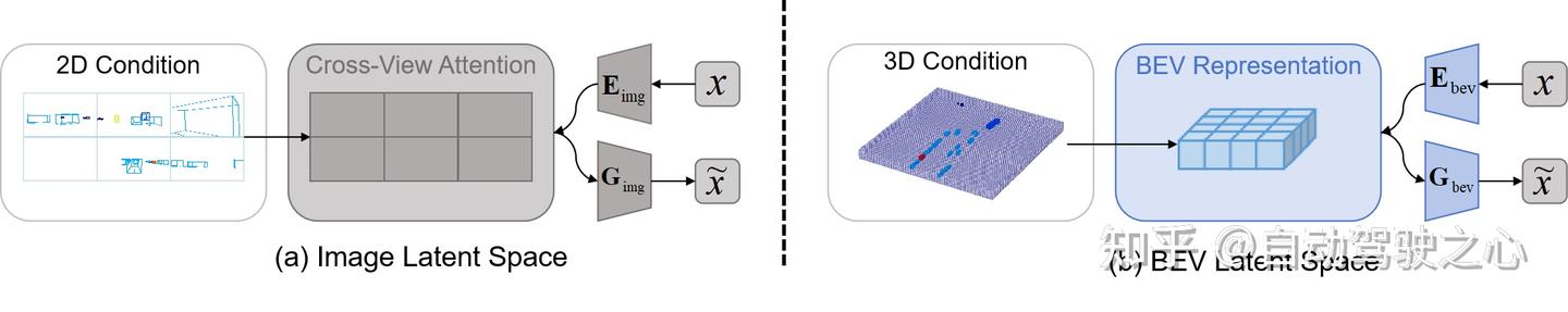 (b) BEV 隐空间生成以3D占用为条件来指导 BEV 隐变量的生成,所有视角的图像都从同一个BEV隐变量中解码,自然地保持空间一致性,并且可以通过调整相机姿势实现新视角图像的生成。