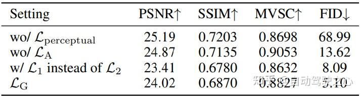 表4. 在 AV2 上的重建损失消融实验:隐变量维度为8时,不同损失组合对生成质量的影响,进一步验证了 BEV 损失函数设计的有效性。