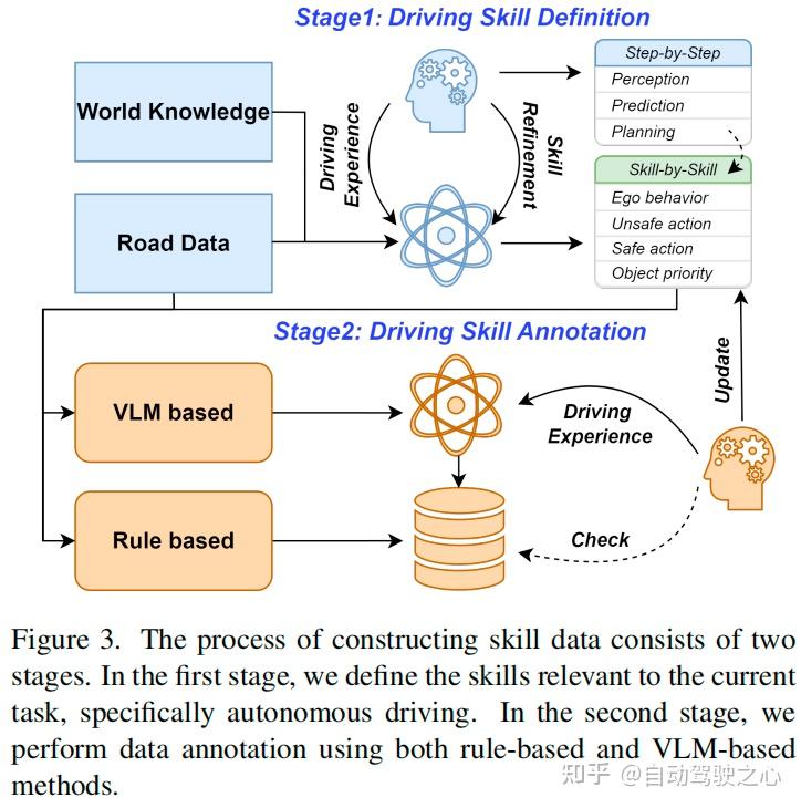 为了实现逐技能学习,路由器必须对驾驶场景和输入文本有更精细的理解,从而根据整体驾驶情境在每个必要阶段引导专家的选择。为了模拟人类的推理和学习过程,我们设计了一种以技能为中心的路由机制,引导模型逐技能地学习和思考。为了构建这种机制,我们首先定义我们的任务——自动驾驶所需的基本技能。需要注意的一点是,这些技能可以在不同的数据集中共享。有了这些技能后,我们使用基于规则的方法或其他大型 VLM(如 GPT-4o