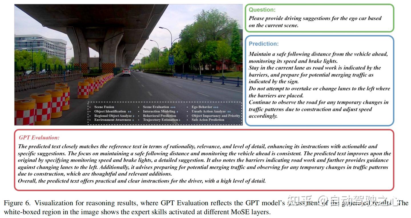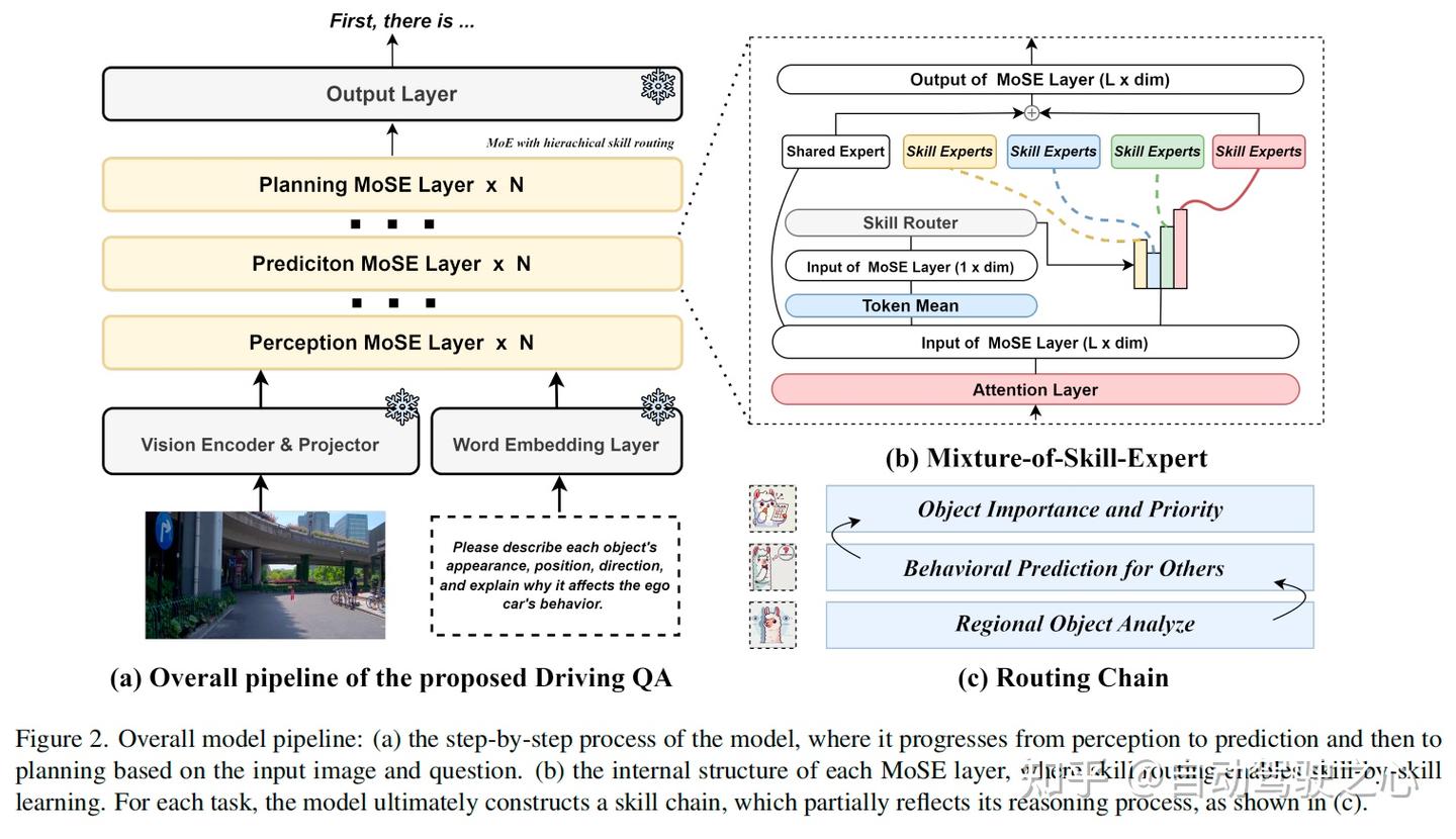 然而,一般的MoE模型通常需要大量的训练数据和复杂的优化过程。在这项工作中,受人类驾驶员学习过程的启发,我们提出了一种面向技能的MoE方法,称为MoSE,它模拟了人类驾驶员的学习和推理过程,逐技能、逐步进行。我们提出了一种面向技能的路由机制,从定义和标注特定技能开始,使专家能够识别各种场景和推理任务所需的驾驶能力,从而促进逐技能学习。进一步地,我们将驾驶过程与人类推理的多步规划以及端到端驾驶模型对齐,构建了一个层次化的技能数据集,并预训练路由器以鼓励模型逐步思考。与多轮对话不同,MoSE在一个单次前向过程中整合了有价值的辅助任务(例如描述、推理、规划),而没有引入任何额外的计算成本。在激活参数少于30亿的情况下,我们的模型在CODA