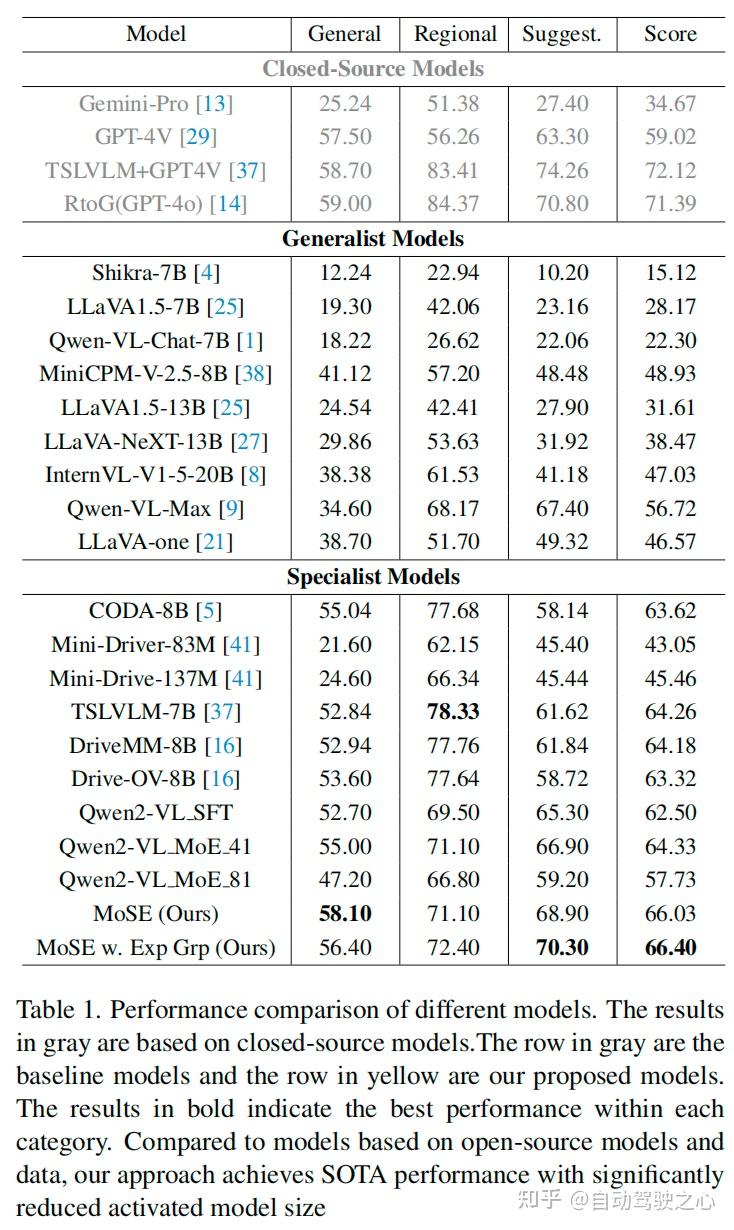 • 与基于开源模型和数据的现有方法相比,MoSE在显著减少激活参数数量(至少减少62.5%)的情况下,在自动驾驶极端情况推理任务中达到了最先进的性能。