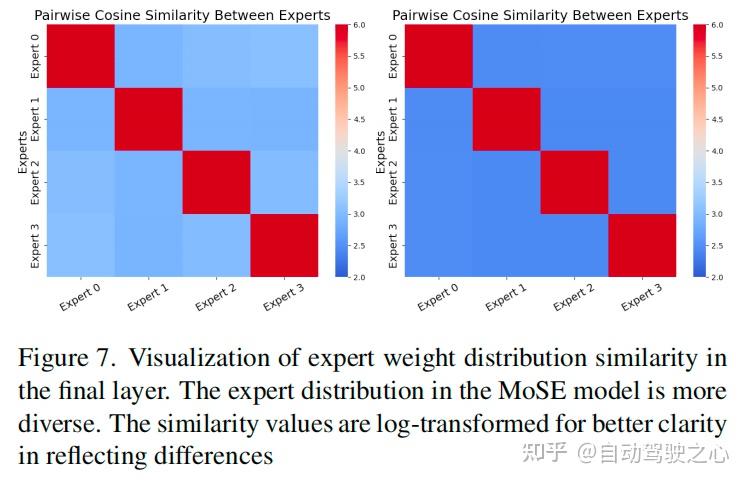 在图 7 中,我们可视化了 MoE 层中每个专家的相似性。在可视化过程中,我们可视化了最后一个 MoE 层,并分析了其中一个 MLP 层的权重。在 MoE 框架中,专家之间的更大差异性通过促进专业化和高效的资源分配增强了模型性能。当专家之间高度不同时,每个专家都能专注于特定的任务或输入分布子集,从而实现更精细的表示和更好的决策。这种差异化有助于减少冗余,确保专家贡献独特的知识,而不是在功能上重叠。此外,更多样化的专家减少了对同一数据的竞争,使得路由器能够做出更具区分性的分配,提高训练效率和泛化能力。如图 7 所示,通过层次化技能路由策略,我们的专家具有更多样化的权重。有关其他层的可视化,请参见补充材料。
