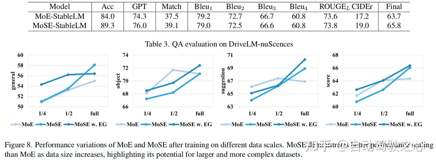 在图 8 中,我们讨论了不同训练数据大小下的模型性能。在训练过程中,我们随机抽取一半和四分之一的常规、对象和驾驶建议问答题,从 CODA 开始,并在相同设置和相同数据集下训练 MoE 和 MoSE,使用官方测试集进行评估。随着数据规模的增加,我们观察到 MoE 模型在训练一半数据时达到性能峰值,数据量继续增长时没有进一步提升。我们假设这一平台期可能是由于专家分配的方式所致。