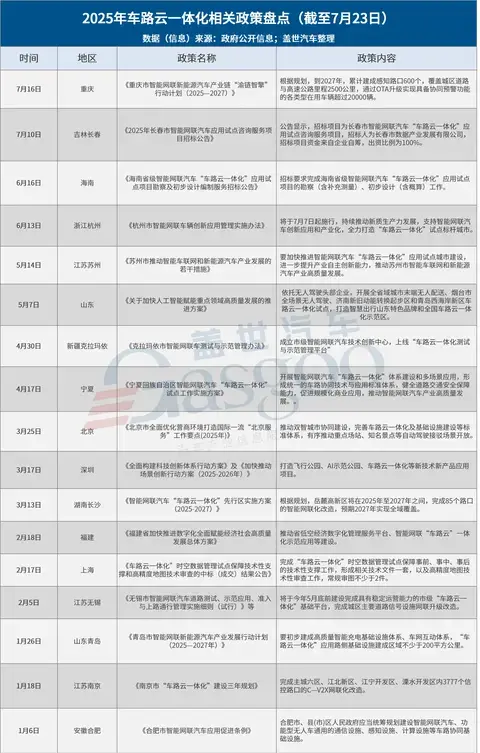 进入2025年,“车路云一体化”建设速度加快。据盖世汽车不完全统计,截至7月23日,超15个地区相继出台相关政策、启动招标项目,展现出在这一领域的积极探索与坚定决心。此篇为2025年车路云一体化相关政策梳理汇总,供业界参考。