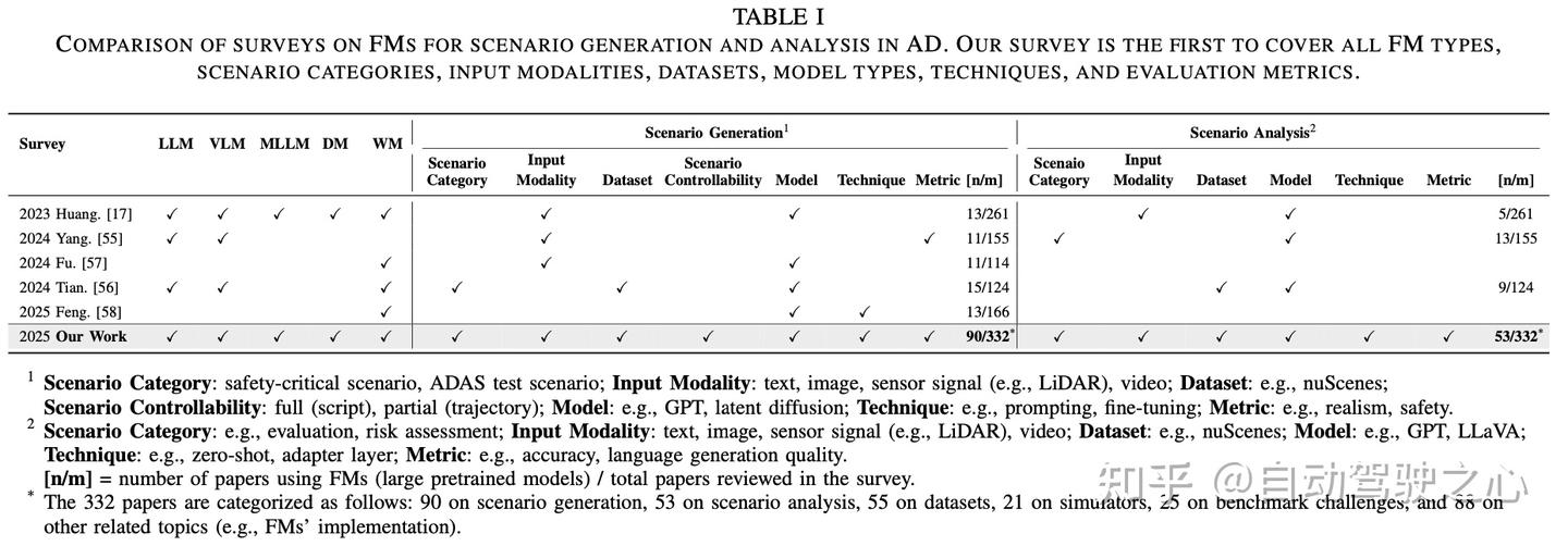 据我们所知,现有的关于自动驾驶和场景生成中基础模型(FMs)的综述(总结见表I)存在以下局限性: