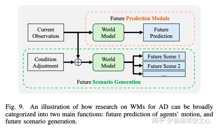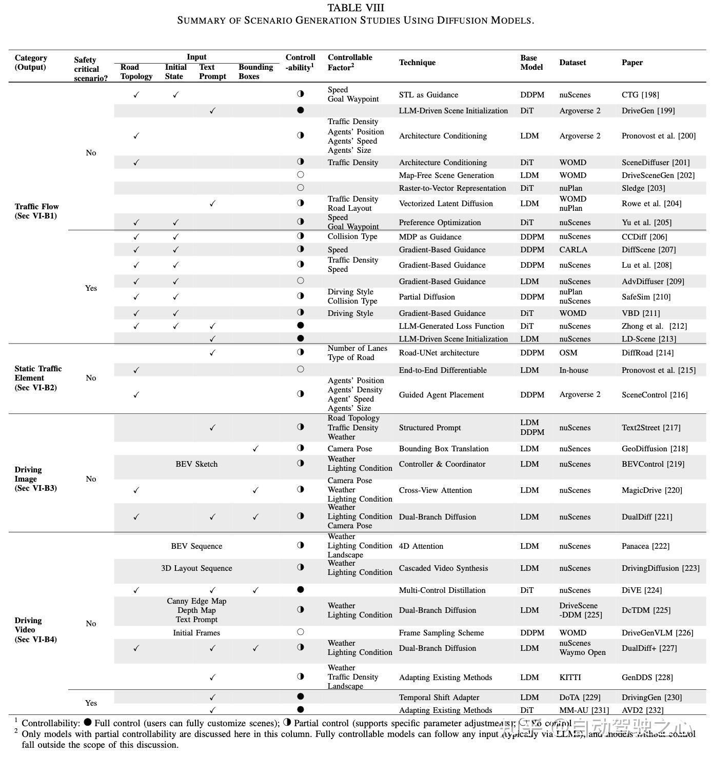 • 扩散模型(DMs)和世界模型(WMs)综述:Fu等人回顾了视频生成和世界模型,涵盖了基于扩散、自回归和强化学习的方法。Feng等人专注于世界模型,将其输出分为图像、鸟瞰图和3D点云,并讨论了语义分割和占用预测等评估指标。然而,这两篇综述都没有将模型输出直接与场景生成任务联系起来。它们也未能区分独立的DMs和WMs,并且缺乏对具体技术和评估策略的讨论。