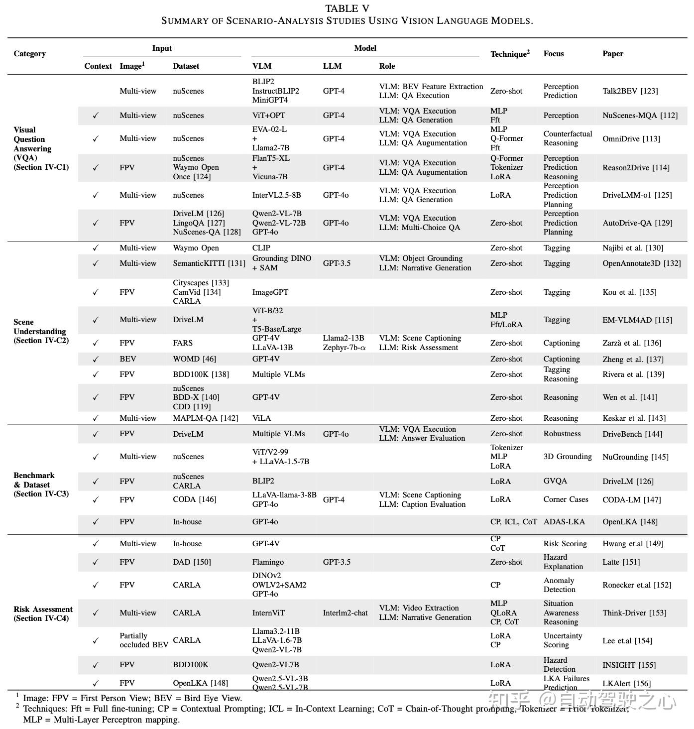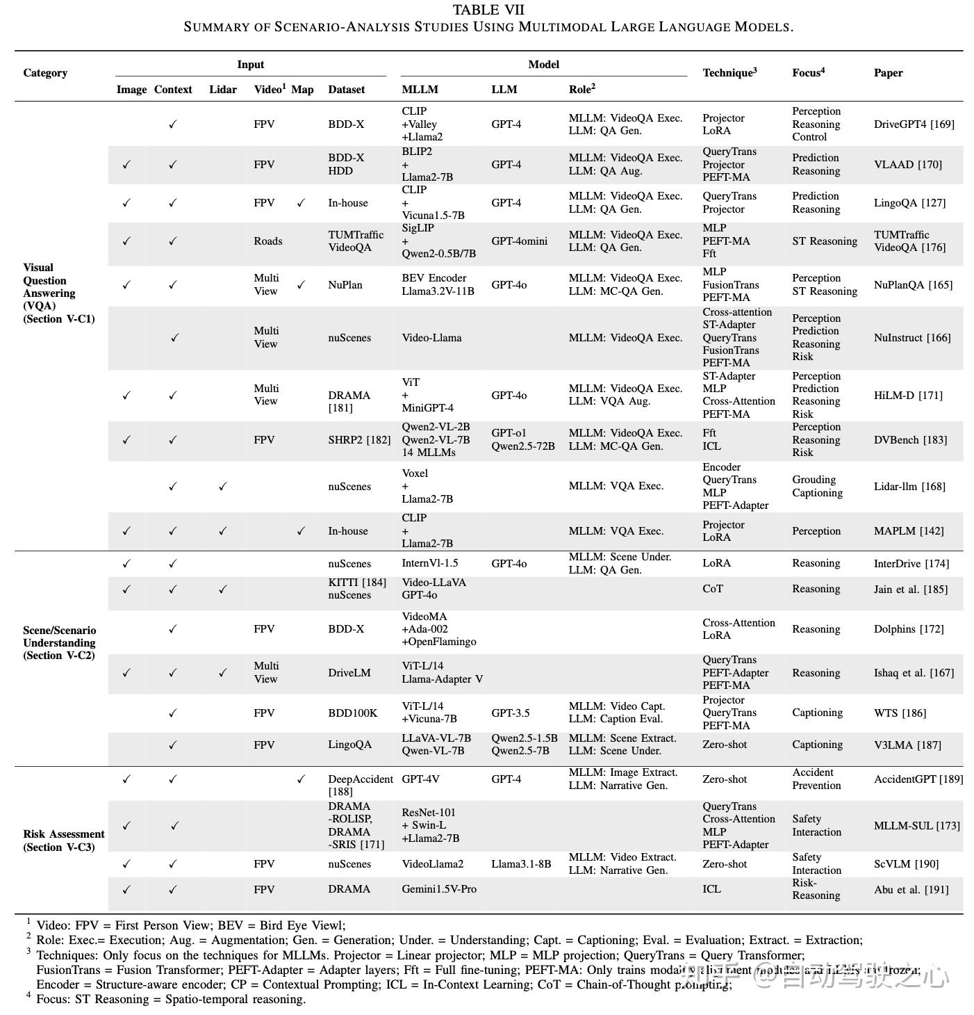 • 对场景分析的覆盖不完整:诸如场景理解、场景评估和风险评估等任务被忽视。即使被涉及,其分析也通常被简化为问答(question answering),很少关注特定任务的模型、方法或评估策略。