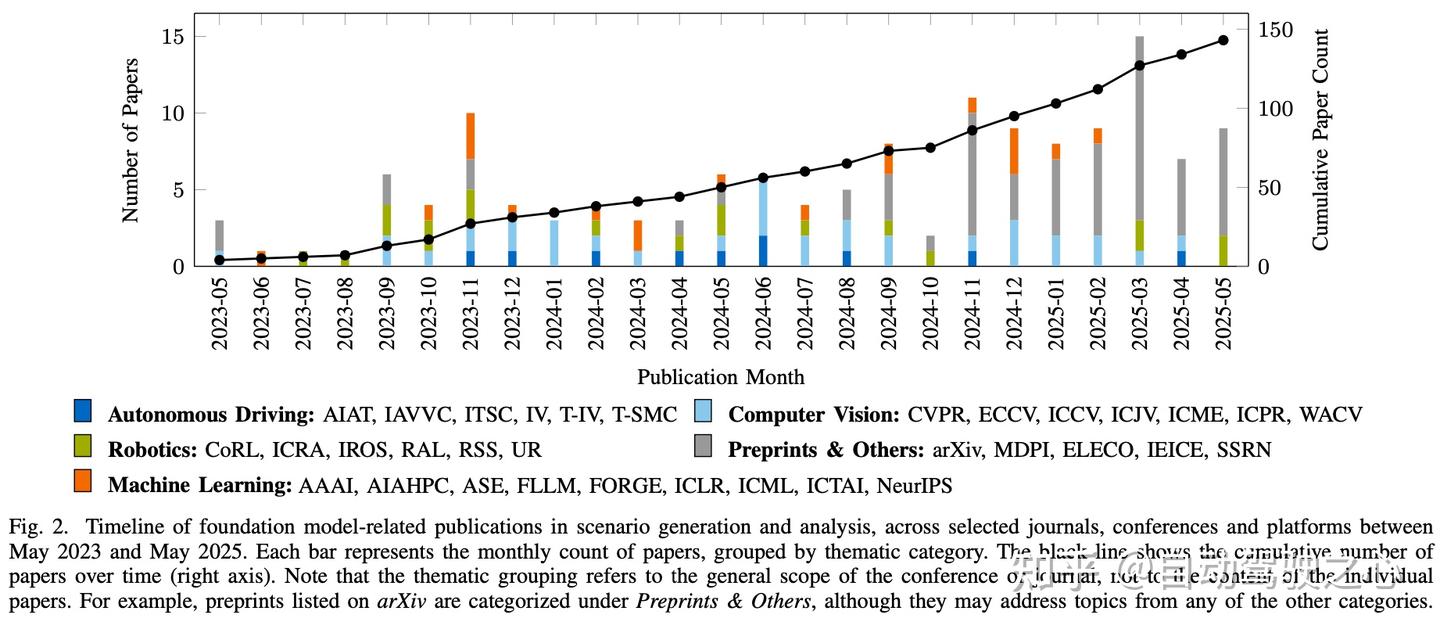 为确保调研的广度与相关性,我们纳入了经过同行评审的会议和期刊论文,以及来自arXiv的预印本。尽管arXiv上的出版物未经正式同行评审,但它们通常能及时呈现具有影响力的研究成果,尤其是在基础模型应用等快速发展的领域。我们的调研涵盖了2022年10月至2025年5月期间发表的论文,主要关注自动驾驶、计算机视觉、机器学习/人工智能(AI)和机器人学领域的会议与期刊。图2展示了论文发表数量的月度趋势及其在不同主题(如会议、期刊或预印本平台)上的分布情况。每篇论文对应的完整出版物列表及可用的开源代码(如有)均包含在论文的GitHub仓库中。