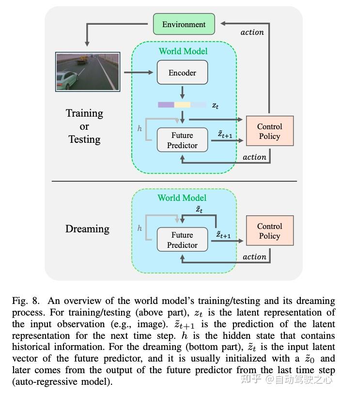 此外,世界模型(WMs)被提出用于学习交互式环境的紧凑表示。这些模型通常由三个组件构成:一个视觉编码器(例如,变分自编码器(VAE))、一个记忆模块(例如,循环神经网络(RNN))和一个控制器(例如,进化策略)。最近的进展将基础模型集成到这些模块中,例如,用扩散模型(DMs)或大语言模型(LLMs)来替换视觉或记忆模块,以增强其推理能力和现实感。这些集成模型可以从多模态输入(例如,文本、视频、传感器数据)中学习环境的动态,并为下游任务(如场景生成、规划和控制)生成可操作的表示。