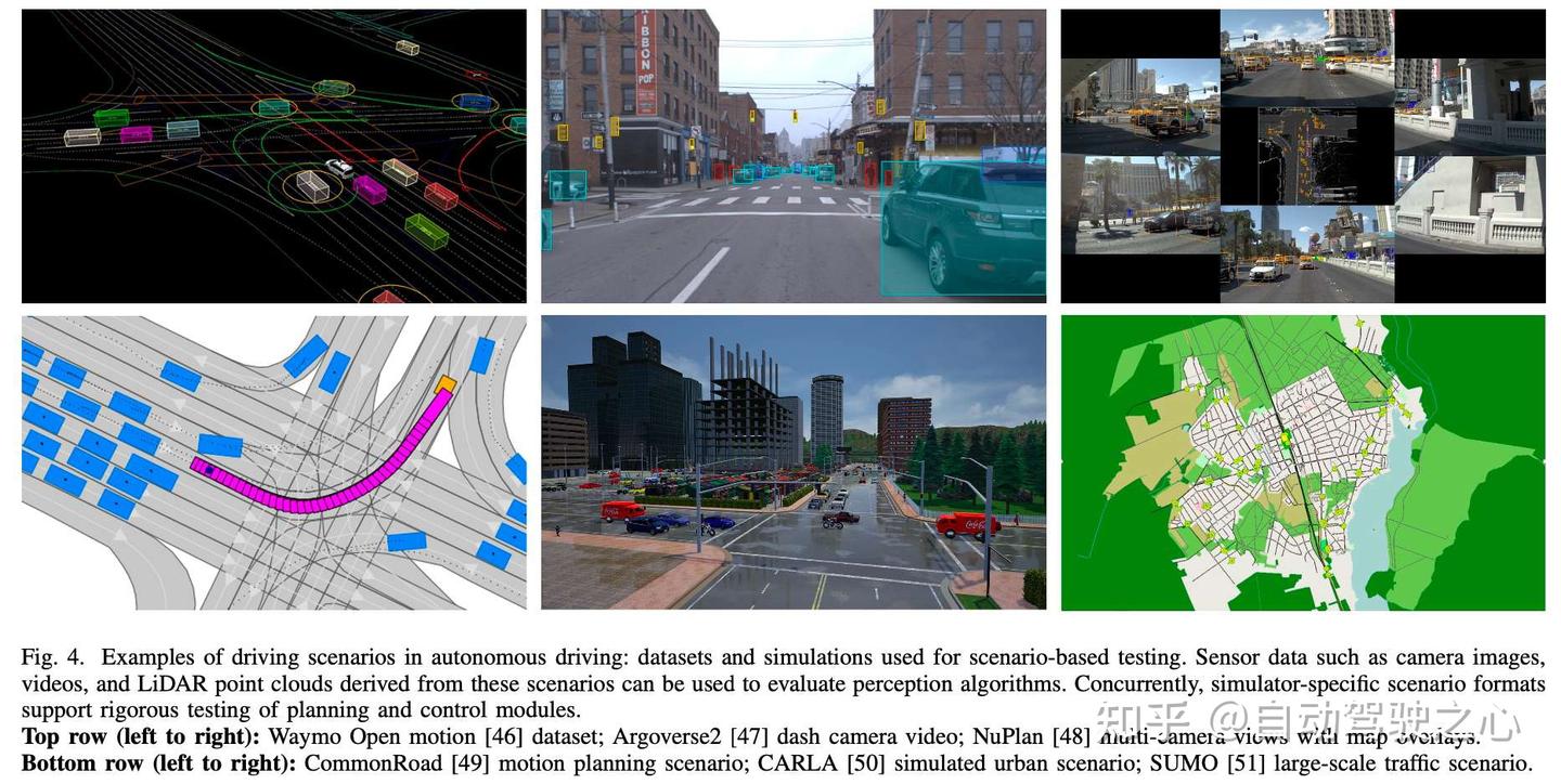 自动驾驶中的场景格式多种多样,从带注释的传感器数据、多摄像头视频流,到基于地图的布局、模拟的城市场景,再到交通级别的环境(例如OpenScenario2)。图4展示了不同格式的驾驶场景示例。