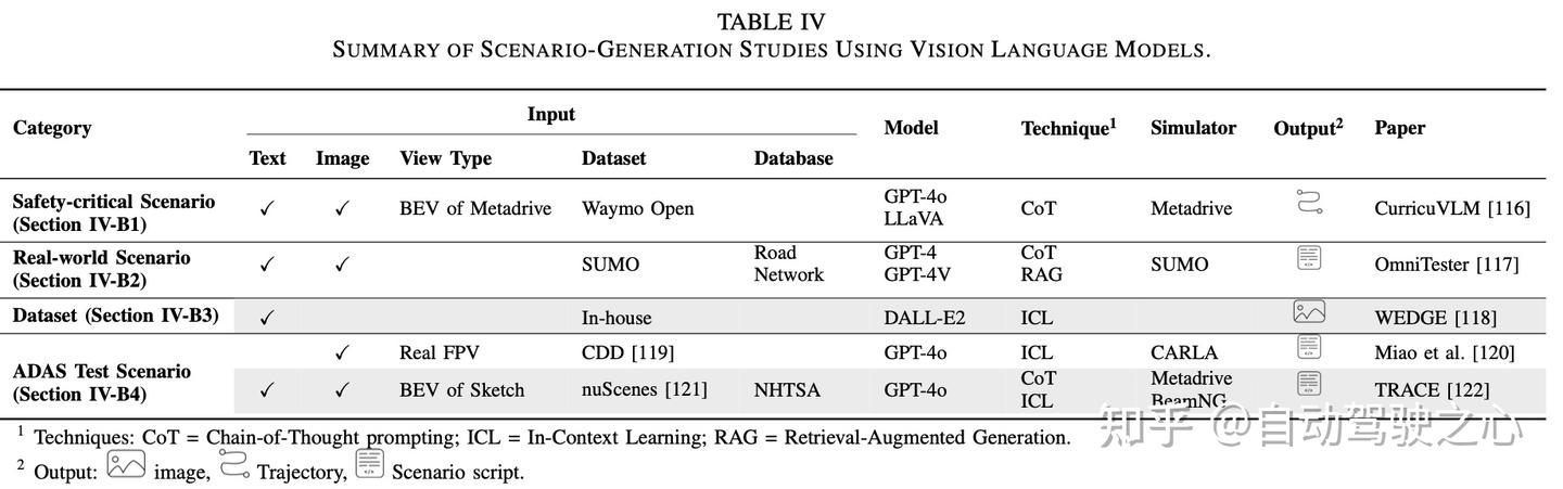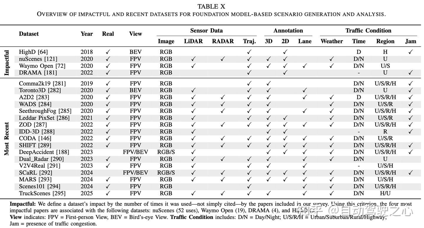 • 模态与任务间关联性有限:尽管一些综述考虑了基础模型的输入模态(例如,文本、图像和车辆传感器数据),但它们并未在这些模态与用于场景生成和分析的技术、模型及数据集之间建立清晰的联系。