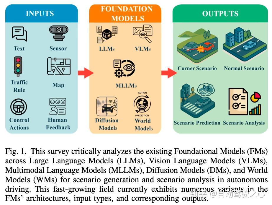 近期的研究探索了将基础模型(FMs)集成到自动驾驶(AD)系统中,利用其适应性和多模态能力,适用于模块化和端到端两种架构。综述文献对当前的研究格局提供了全面的概述,涵盖了LLMs、VLMs、MLLMs、DMs和WMs。尽管这些工作涵盖了感知、规划、决策、仿真和测试,但并未明确阐述FMs在场景生成与分析中的具体作用。