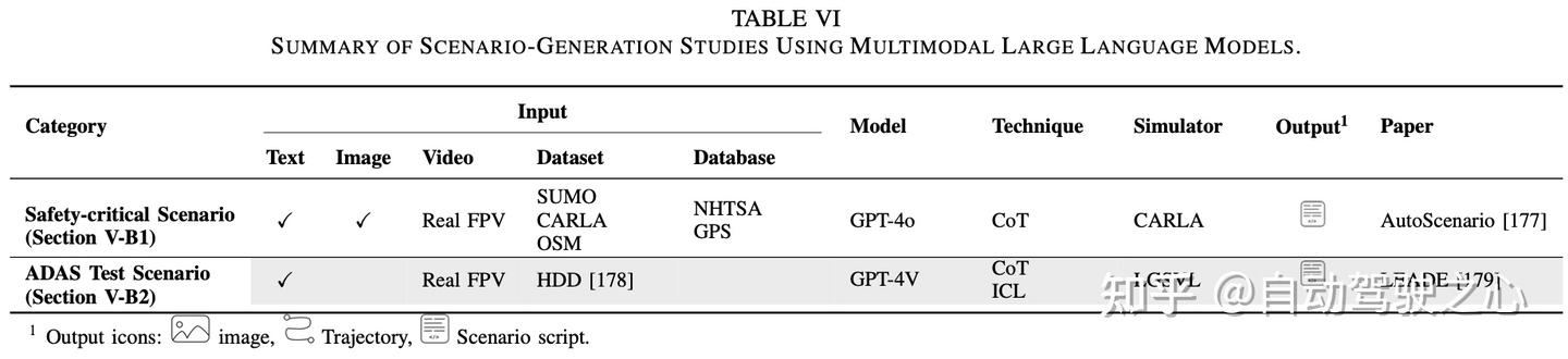 3. 自动驾驶中的多模态大语言模型(MLLMs):Cui等人的综述聚焦于MLLMs的架构、模态融合及其在AD任务中的应用。Fourati等人的综述将XLMs定义为LLMs、VLMs和MLLMs的结合,回顾了它们在AD中的应用,涵盖了概念、工作流程和技术。最后,Li等人的综述探讨了LLM和MLLM在不同AD模块中的应用,涵盖了集成和训练技术。然而,在这三篇综述中,场景生成仅被简要提及,并非其主要关注范围。