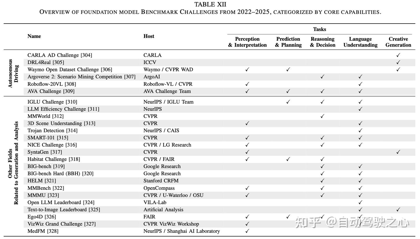 3. 对数据集、仿真平台和现有基准竞赛的回顾:我们回顾了用于场景生成与分析的公开可用数据集和仿真器。同时,我们首次对自动驾驶领域基础模型的基准竞赛进行了系统性回顾。