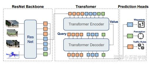 架构,如图3所示。输入数据包括前、前左、前右的摄像头数据、激光雷达点云和导航路径点。输出结果包括交通参与者的感知数据、自车的轨迹以及交通标志、路口检测结果等等。