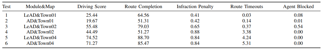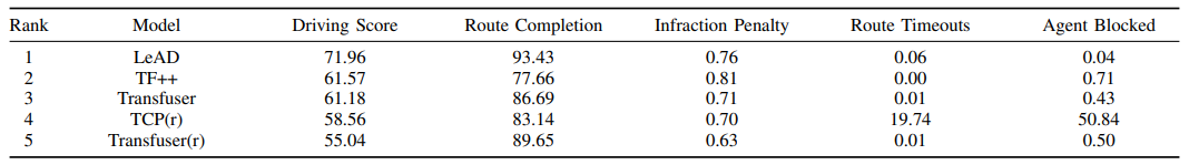 图5展示了LeAD与CARLA中四个模型的比较结果。可以看出LeAD实现了最佳的驾驶得分,取得了最佳的性能。