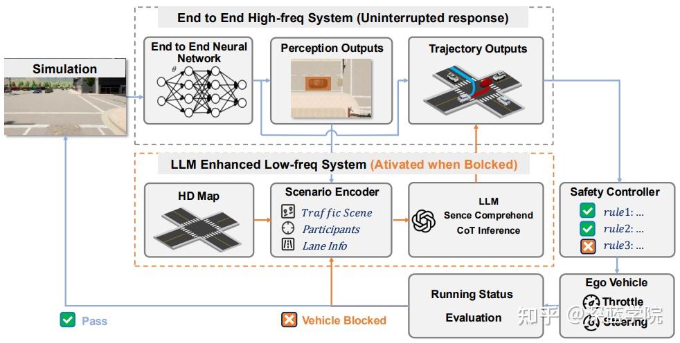 当遇到边缘场景时,车辆首先尝试通过端到端系统决策流进行解析;如果场景仍未解析,安全控制器将启动保护性停止。如果当超过预设的等待阈值时,LLM冗余系统将启动;接下来LLM处理当前环境状态和感知数据,以制定高级决策,最后通过慢系统的安全控制器执行车辆操作。