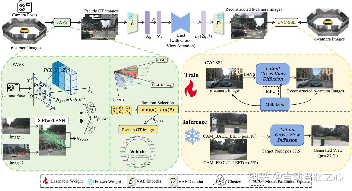 FAVS采用分层匹配策略,首先使用相机姿态建立粗略几何对应关系,然后通过改进的特征匹配算法进行细粒度对齐,并通过聚类分析识别高置信度匹配区域。在此基础上,CVC-SSL采用自监督训练范式,其中模型使用扩散模型从合成的拼接图像重建原始相机视角,在不要求外推数据监督的情况下强制执行跨视角一致性。我们的框架仅需要多相机图像及其相关姿态进行训练,无需额外的传感器或深度图。
