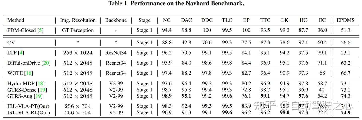 3. IRL-VLA框架在CVPR2025挑战赛的NAVSIM v2端到端驾驶基准测试上取得了卓越的性能。这些结果证明了我们方法的有效性和通用性。