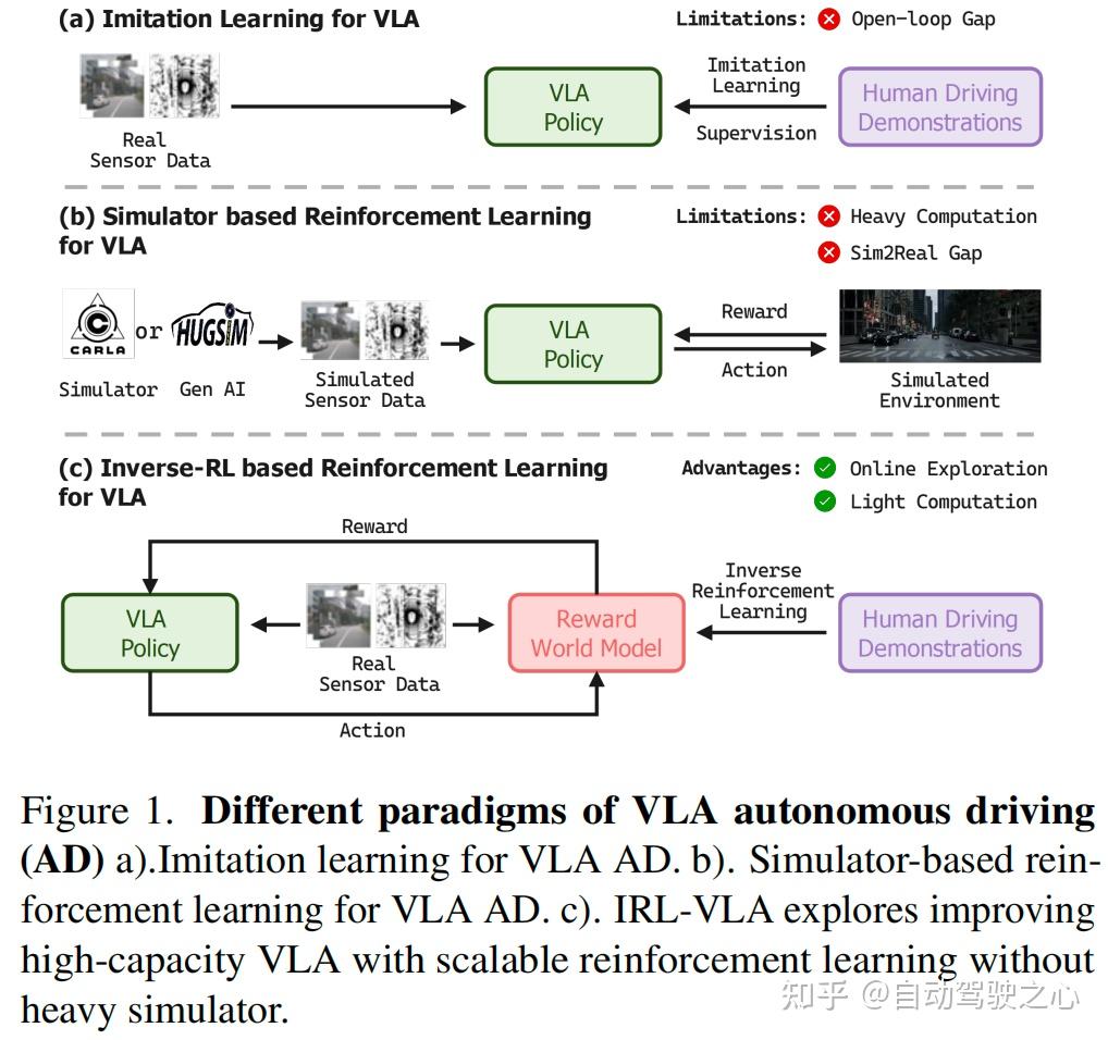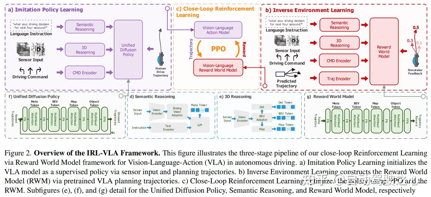 在本文中,如图1.c所示,我们介绍了一种新颖的闭环强化学习框架,该框架通过逆向强化学习(Inverse Reinforcement Learning)与我们自建的VLA方法相结合,命名为IRL-VLA。利用我们的框架,设计并学习了一个实时奖励世界模型(Reward World Model, RWM),该模型通过从多样化策略中进行逆向强化学习获得。它捕捉了驾驶的多模态和多目标本质,同时能够以一种成本效益高的方式扩展到大量真实世界数据,从而规避了Sim2Real的领域适应问题。我们应用所学习的RWM来指导我们VLA模型的强化学习。我们的方法在NAVSIM v2端到端驾驶基准测试中达到了最先进的性能,在CVPR2025自动驾驶大奖赛中以45.0 EDPMS的成绩获得亚军。
