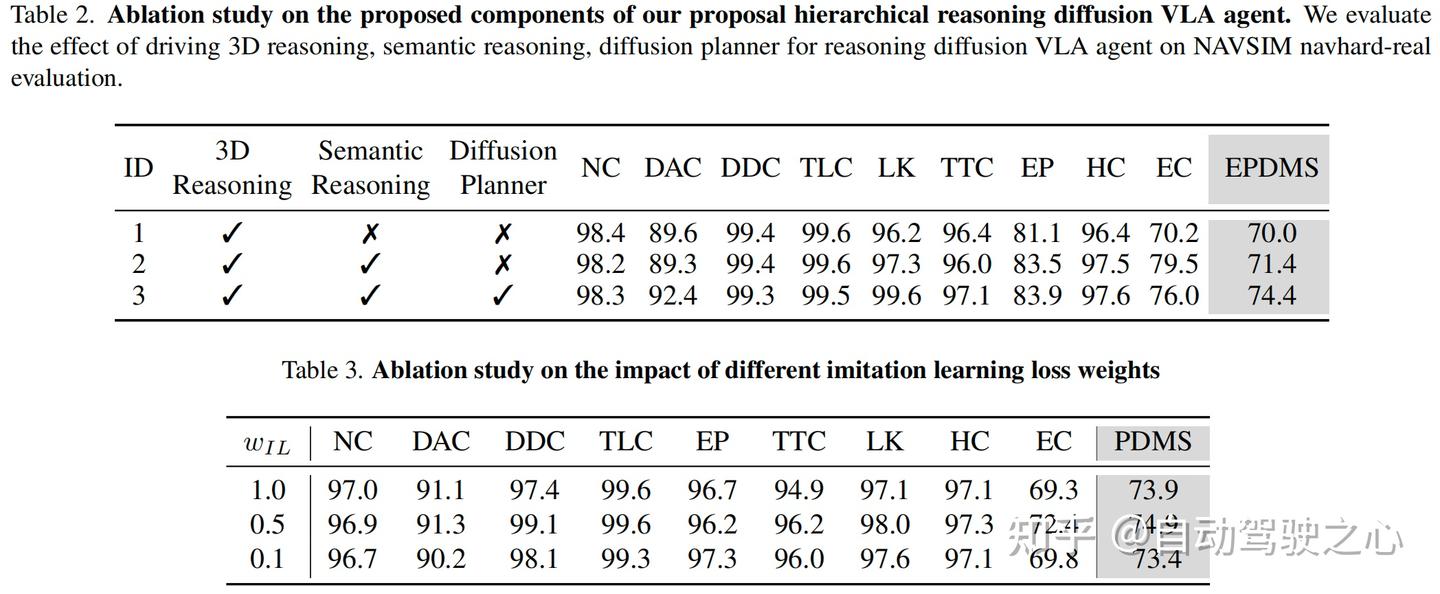 分层推理扩散VLA智能体的消融研究:表2展示了我们提出的IRL-VLA分层推理扩散VLA智能体的消融研究。仅使用3D推理并通过人类驾驶演示数据进行训练时,模型在Navhard-real基准测试上取得了70.0的EPDMS。引入语义推理模块和我们的高层驾驶指令查询后,EPDMS提升了1.4。最后,引入用于连续轨迹预测的扩散规划器后,EPDMS进一步达到了74.4,提升了3.0。这证明了我们分层推理扩散VLA方案的价值,该方案在产生更安全、更舒适的驾驶行为方面具有强大的预训练性能。