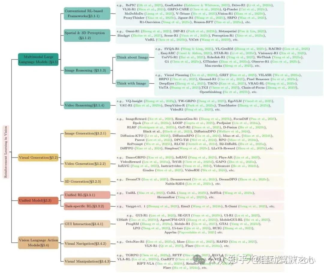 MLLM的RL目标是“对齐视觉-语言推理与人类需求”,分四类研究方向: