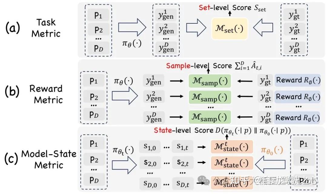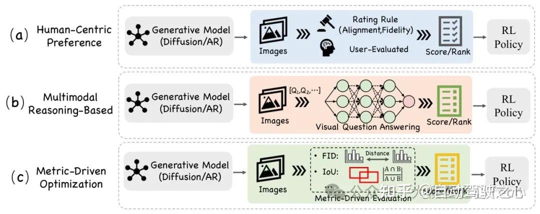 - 常用指标:人类偏好分数(ImageReward、HPS)、可验证指标(IoU、代码通过率)、模型偏好分数(CriticGPT、VideoPrefer)。