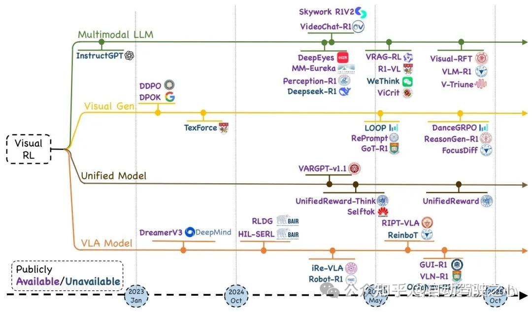 视觉强化学习的爆发源于强化学习在大语言模型(LLM)中的成功迁移。RL通过“人类反馈强化学习(RLHF)”“DeepSeek-R1”等范式,显著提升了LLM的人类偏好对齐与复杂推理能力(如InstructGPT)。受此启发,研究者将RL拓展至多模态大模型,涵盖: