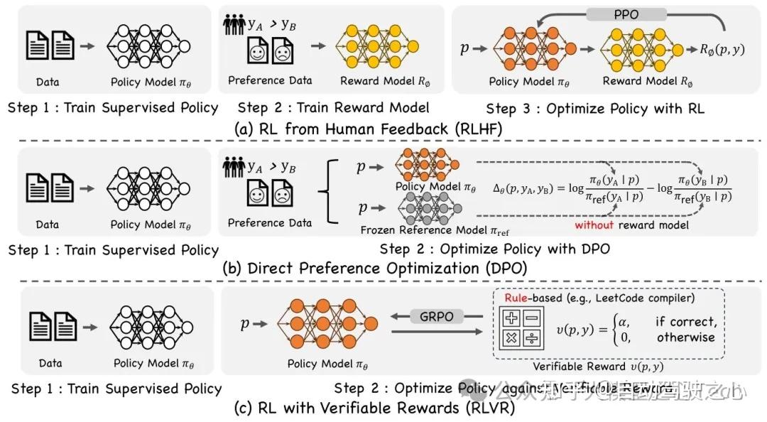 RLVR用确定性、可编程验证的奖励替代主观人类偏好,解决RLHF数据成本高、DPO依赖偏好数据的问题(图2c):